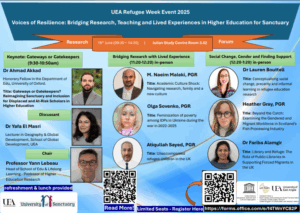 We would love to attend you to Voices of Resilience: Bridging Research, Teaching and Lived Experiences in Higher Education for Sanctuary. This event is taking place at the University of East Anglia, Norwich, on the 16th of June from 9.30-14.30. There is also an opportunity to attend the live keynote presentation by Dr Ahmad Akkad online between 9.30-10.50. To register to attend either in person, or online, please fill out the following form. Please do also share this event amongst your networks.This forum blends academic research and lived experiences in the field of refugee studies. It presents the importance of amplifying the voices of refugees themselves, while admiring the contributions of researchers who are working to address the challenges and opportunities faced by forced displaced communities. The theme underscores the resilience of refugees and the role of research in fostering understanding, advocacy and policy change.